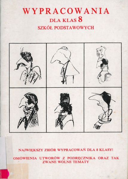 Tyt. okł.: Wypracowania dla klas 8 szkół podstawowych : największy zbiór wypracowań dla 8 klas!, lektury obowiązkowe, uzupełniające, omówienia utworów z podręcznika oraz tak zwane wolne tematy.