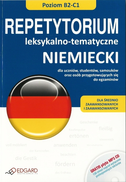 "Niemiecki: Repetytorium leksykalno-tematyczne": nauka XX słów, wyrażeń i kolokacji; kilkadziesiąt zagadnień uporządkowanych w 14 rozdziałach; XX interesujące teksty pokazujące użycie słów w praktyce; ponad 130 różnorodnych ćwiczeń z odpowiedziami; współczesne, aktualne słownictwo, potoczne zwroty oraz idiomy; specjalnie opracowane testy powtórkowe i minisłowniczki; płyta Audio CD gratis. Nowoczesne "Repetytorium leksykalno-tematyczne" umożliwia poznanie lub przypomnienie sobie około XX słów i zwrotów na poziomie średnio zaawansowanym i zaawansowanym (B1-C1 wg klasyfikacji Rady Europy). Zestaw (książka + płyta CD Audio) adresowany jest do uczniów, samouków oraz wszystkich, którzy chcą poszerzyć zasób niemieckiego słownictwa, przypomnieć sobie i skutecznie utrwalić znajomość niezbędnych na co dzień zwrotów. Opracowany został on również z myślą o uczniach szkół średnich, studentach, osobach przygotowujących się do egzaminów językowych. Repetytorium może być także pomocne dla nauczycieli – zawiera liczne ćwiczenia do wykorzystania podczas lekcji lub zajęć indywidualnych. Podręcznik obejmuje kilkadziesiąt zagadnień usystematyzowanych w 12 rozdziałach tematycznych. W każdym podrozdziale znajdują się: wprowadzenie do tematu, przykładowy tekst, słownictwo podstawowe oraz dodatkowe wraz z tłumaczeniami, a także różnorodne ćwiczenia sprawdzające i utrwalające. Samodzielne sprawdzenie wiedzy umożliwia ponad XXX różnorodnych ćwiczeń, m.in. pytania typu prawda/fałsz, łączenie w pary, krzyżówki i wykreślanki. Podręcznik obejmuje również specjalnie opracowane testy podsumowujące, a na końcu znajduje się pełny klucz odpowiedzi. Płyta CD Audio jest doskonałym uzupełnieniem nauki z podręcznikiem. Zawiera XX minut nagrań wysokiej jakości w wykonaniu rodowitego Niemca. Jest szczególnie pomocna w nauce prawidłowej wymowy oraz w ćwiczeniu umiejętności rozumienia ze słuchu.