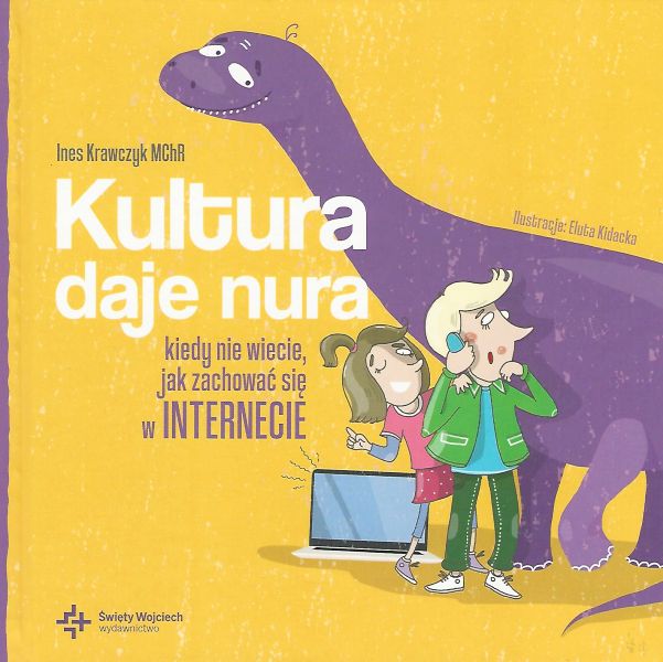 Co zrobić, by nie zagubić się w sieci, i w jaki sposób zadbać, by KULTURA przez nasze zachowanie nie dała nura? Podpowiedzą wam to Tosia i Kuba (oraz pewien domowy… dinozaur), którzy na swojej skórze przekonali się, jak się kończą historie z dzwoniącym telefonem w kinie czy nielegalnym ściąganiem filmów z sieci. Oni wiedzą już, jak poradzić sobie z hejterami i że internetowe znajomości należy zawierać bardzo ostrożnie. Dzięki tej książce dowiesz się: dlaczego w sieci należy chronić swoje dane osobowe; kiedy nie wypada pisać esemesów i rozmawiać przez telefon; dlaczego do sieci nie wrzuca się zdjęć innych osób bez pytania; że hejt jest niedopuszczalny.
