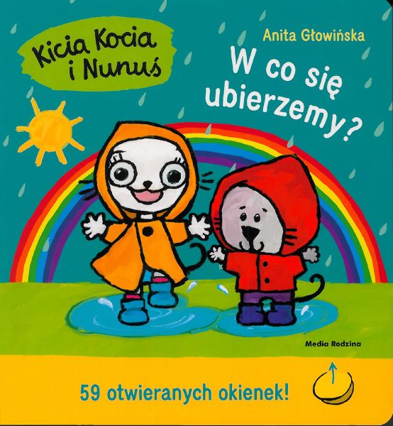 Kicia Kocia i Nunuś wiedzą, że w każdą pogodę można się dobrze bawić, trzeba się tylko odpowiednio ubrać. Nunuś wkłada kalosze, kiedy pada, ubiera się ciepło, kiedy jest mroźnie, a na plażę zabiera okulary przeciwsłoneczne i krem z filtrem. Nunuś wie już wszystko o pogodzie! Wszystkie odpowiednie ubrania i przedmioty ukryte są w otwieranych okienkach.