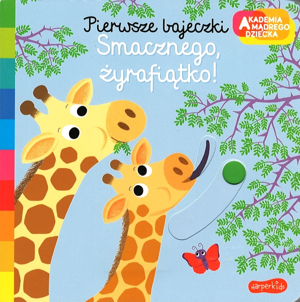 To kolejna książeczka z serii "Pierwsze bajeczki". Tym razem nasz czytelnik dowiaduje się, co je mała żyrafa. Zwierzątko najpierw pije mleczko mamy, potem próbuje wody z jeziora – co przez długą szyję nie jest to proste. Uwielbia zjadać zielone listki z drzew, aż wreszcie, po całym dniu spędzonym z mamą, zasypia z pełnym brzuszkiem. "Pierwsze bajeczki" to seria książeczek dla dzieci i rodziców do wspólnego oglądania i czytania. Ruchome elementy doskonale wspierają rozwój maluchów i rozwijają ich sprawność manualną. Piękne kolorowe ilustracje sprawiają, że dzieci z przyjemnością odkrywają świat wokół siebie.