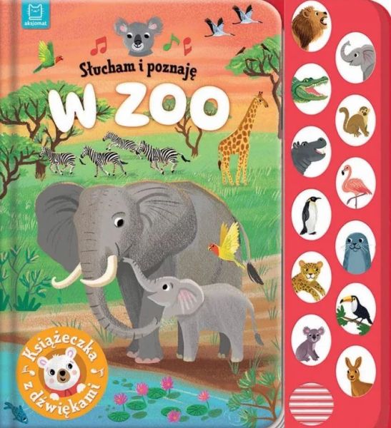 Książka dla małych miłośników zwierząt, a w niej bogate i staranne ilustracje oraz wierszowane historyjki o zwierzakach z zoo. Dodatkową niespodzianką dla dzieci są dołączone dźwięki. Posłuchaj, jak brzmią lew, słoń, krokodyl, małpka, hipopotam, flaming, pingwin, foka, jaguar, tukan, koala i kangur. Naciśnij przycisk z obrazkiem, aby włączyć dźwięk. Chcesz wyłączyć, naciśnij przycisk jeszcze raz. Zabawa z książką rozwija zmysły malucha. Wesołe i łatwe do zapamiętania wierszyki rozwijają pamięć i percepcję dziecka, które wzbogaca również swoją wiedzę o odgłosy wydawane przez pokazane w książce zwierzęta. Twarda oprawa i kartonowe karty sprawiają, że książka jest trwała i bezpieczna, a format odpowiedni dla małego dziecka. Do czytania, słuchania i oglądania.
